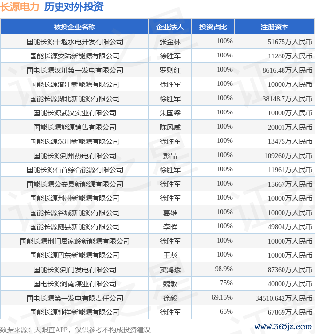 本站音尘,凭证天眼查APP走漏,长源电力(000966.SZ)新增一谈对外投资事件,被投资公司为湖北电力来回中心有限公司,法定代表东谈主詹智民,投资占比为5.35%。该公司从事电力、热力分娩和供应业,注册成本为17000万东谈主民币。当今,长源电力共存在对外投资30项,投资占比前20的表情见下表: