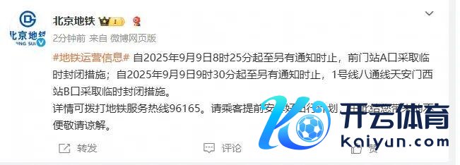 凭证@北京地铁 音问九游体育娱乐网,自2025年9月9日8时25分起至另有奉告时止,前门站A口采选临时阻塞法度;自2025年9月9日9时30分起至另有奉告时止,1号线八通线天安门西站B口采选临时阻塞法度。